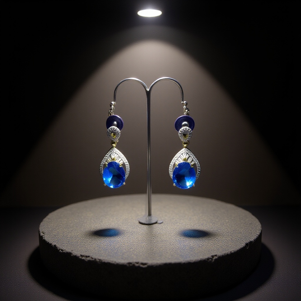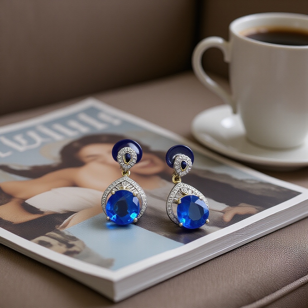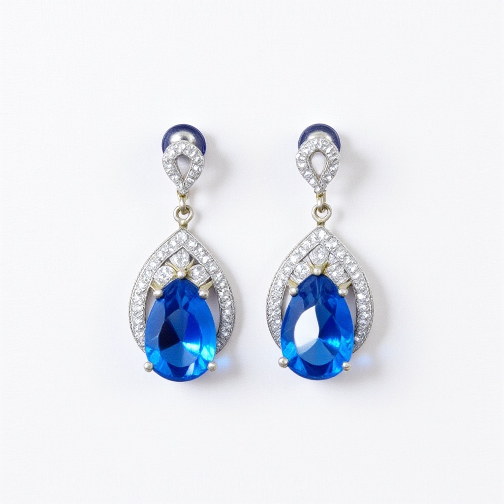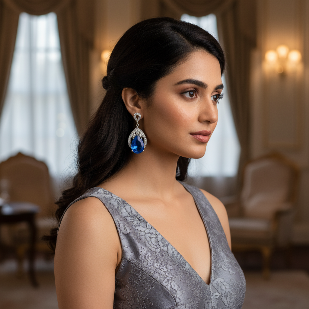 The design of these earrings is inspired by classic royal elegance blended with modern fashion. The teardrop-shaped blue stone sits gracefully within a sparkling white gold-plated frame, creating a design that is versatile and universally appealing.