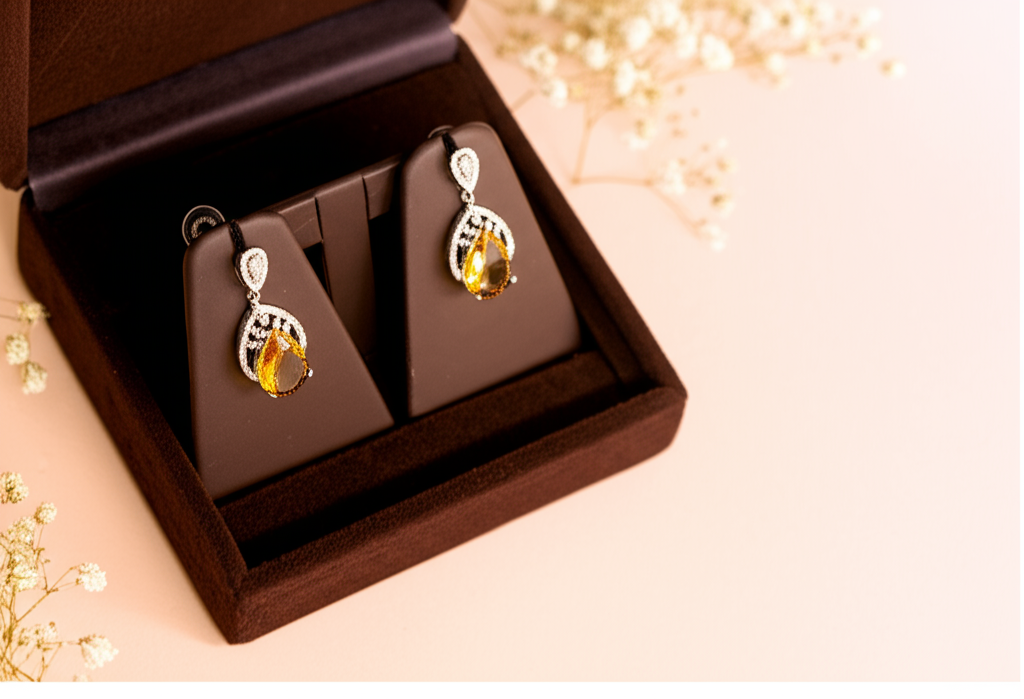 White Gold Plated Earrings with Deep Yellow Glass Stones – Elegant, durable & timeless dangle jewelry. Perfect gift for women, designed for every occasion.