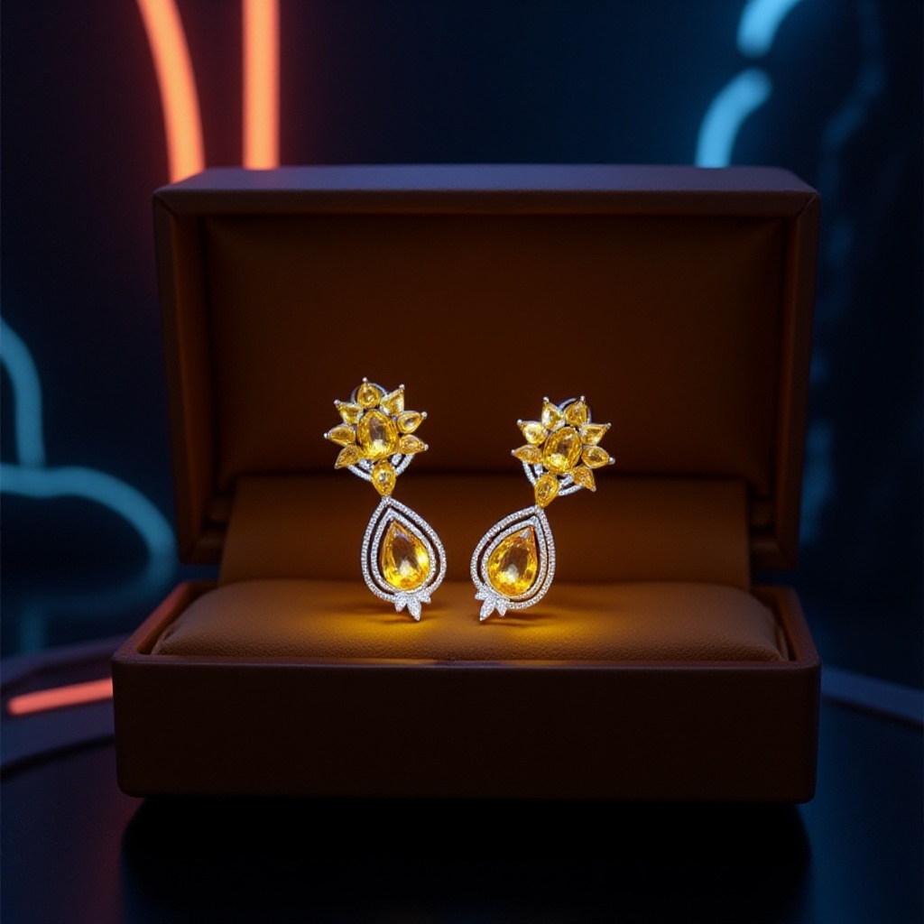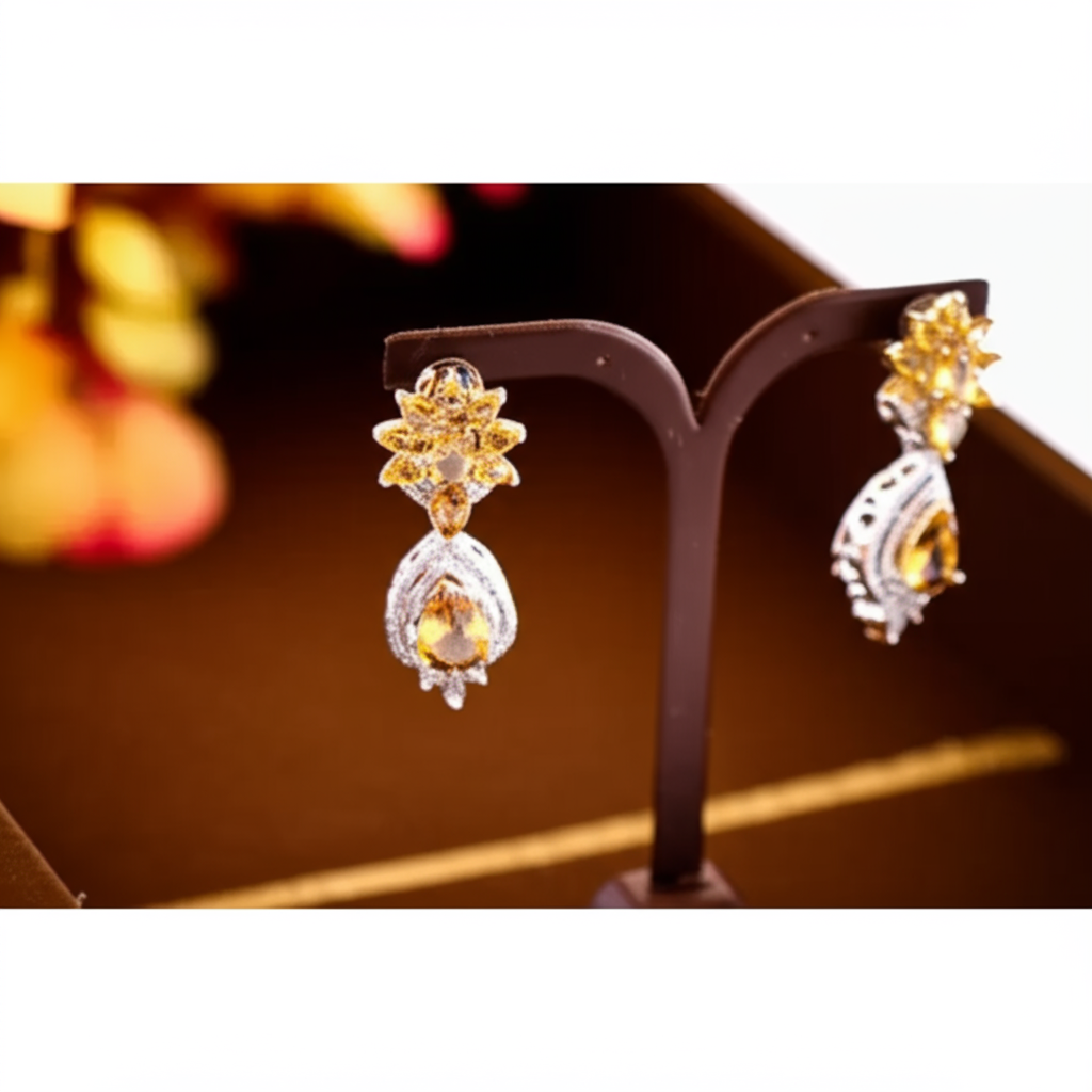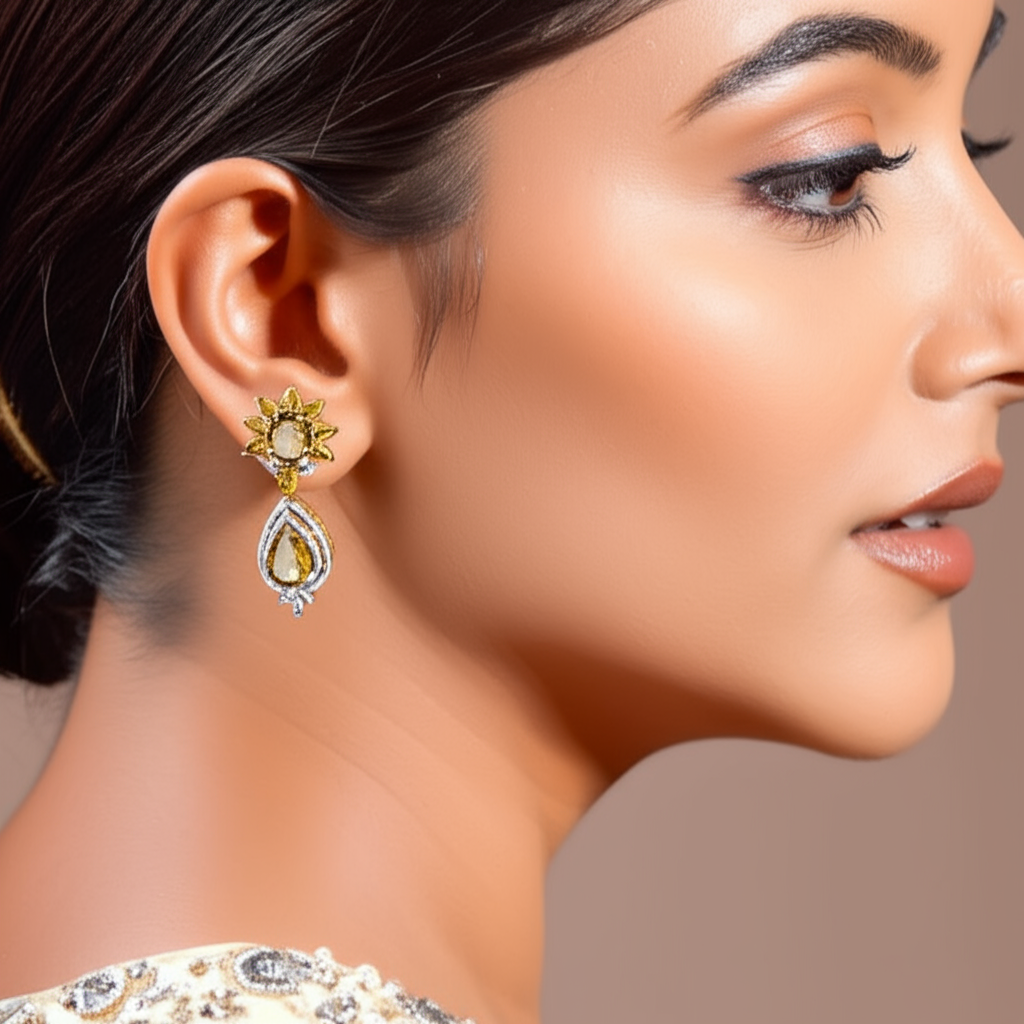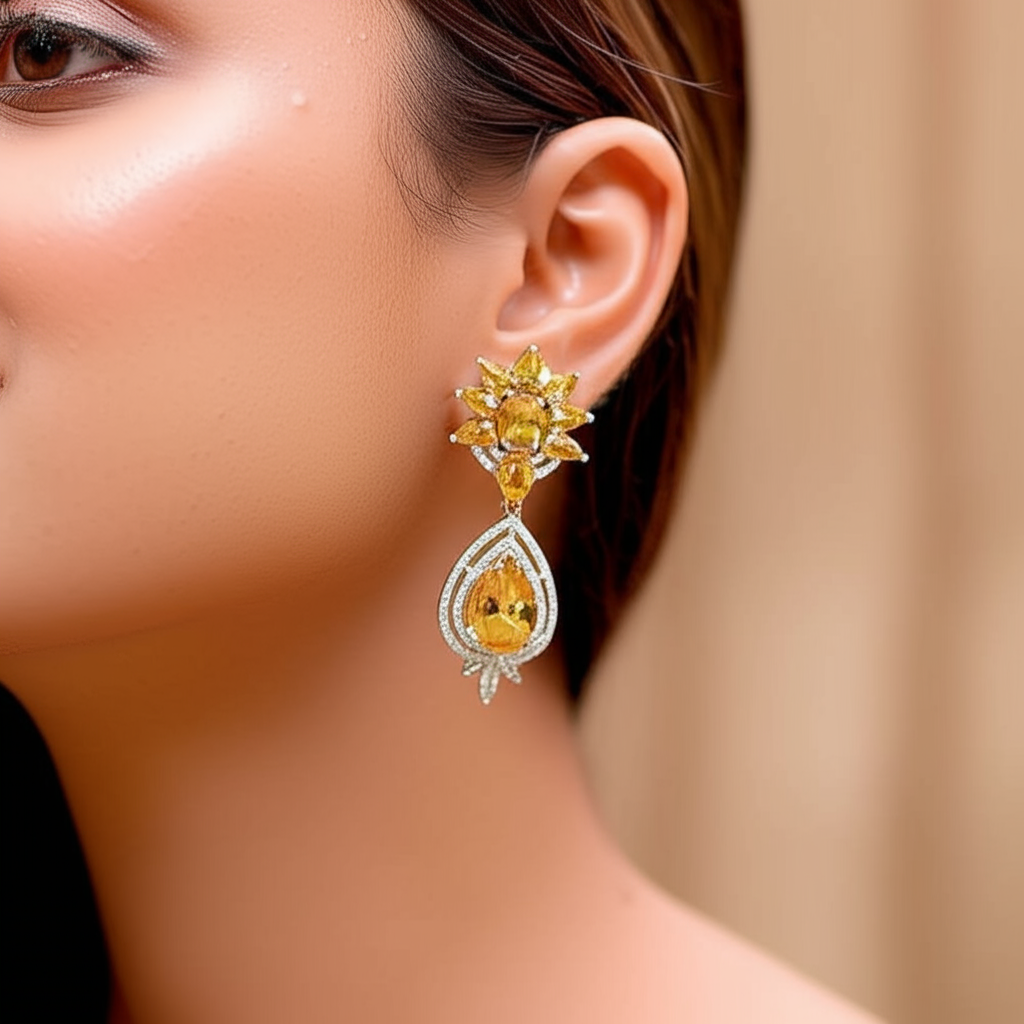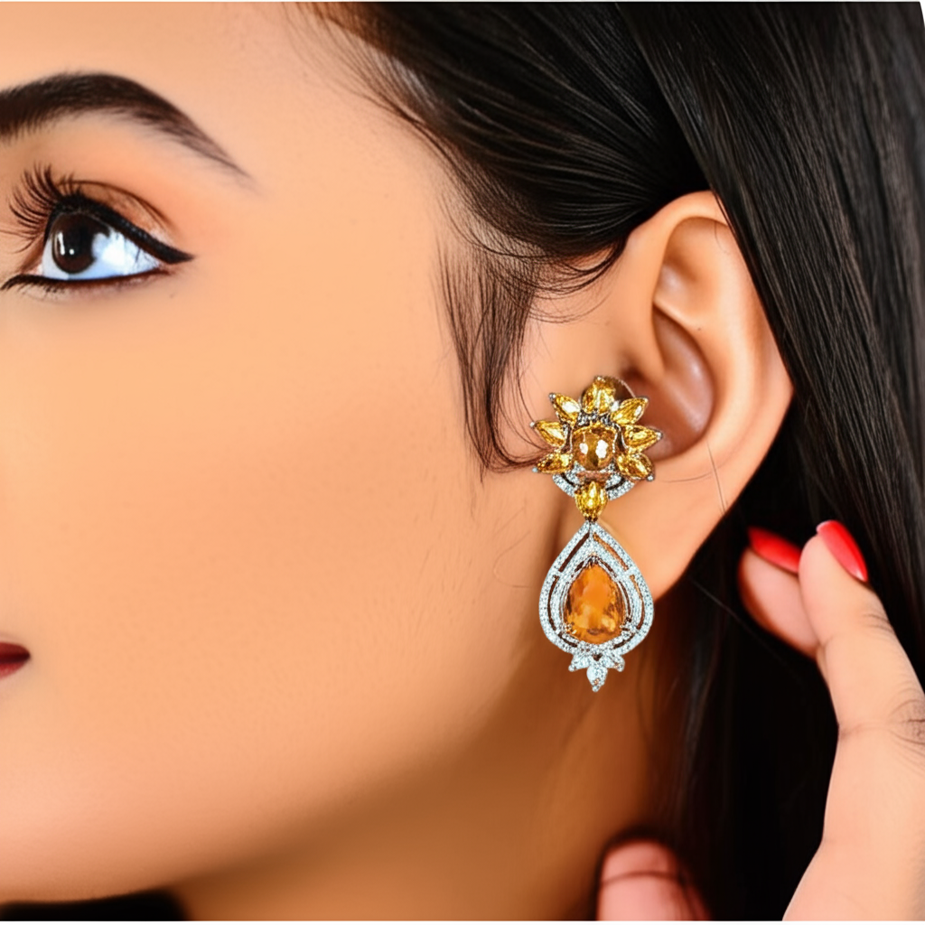 These earrings are timeless yet trendy, combining the richness of deep yellow stones with the brilliance of American diamonds. They add instant sophistication to ethnic, Indo-western, and even formal outfits, ensuring you stand out.