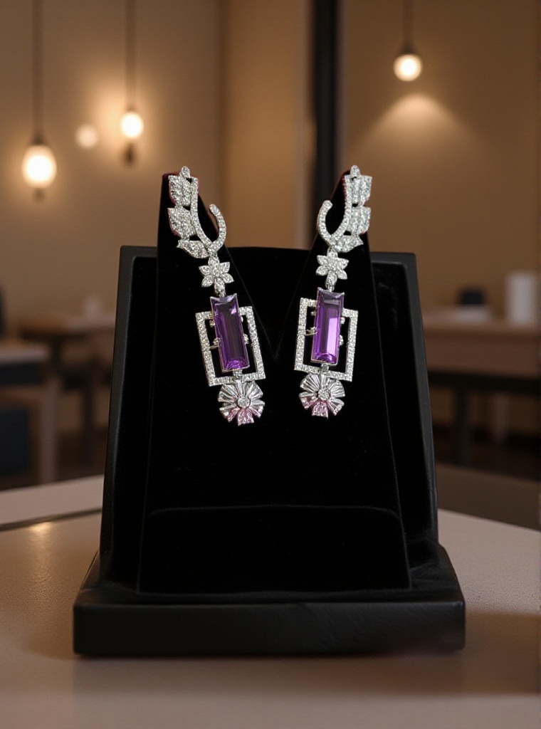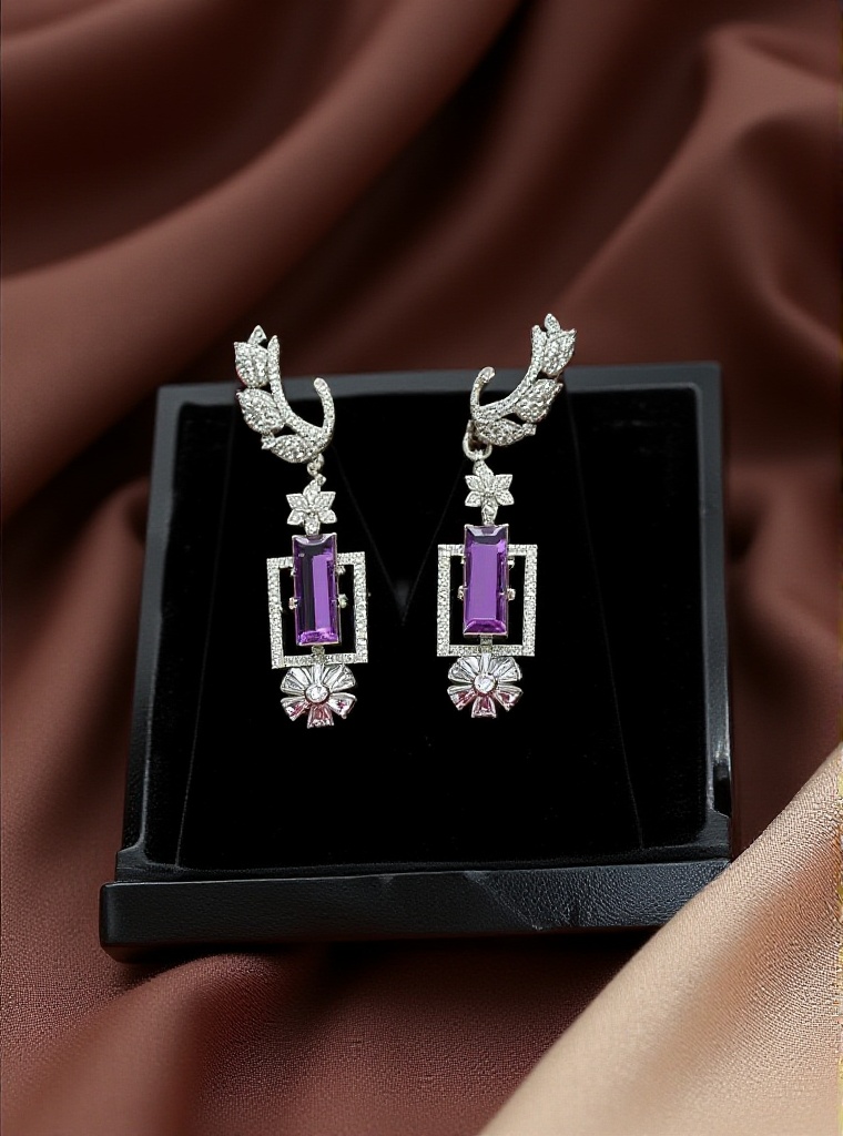 White Gold-Plated Statement Earrings with Amethyst Glass Stone – Experience sophisticated glamour with these White Gold-Plated Statement Earrings, designed to redefine elegance for today’s discerning jewelry lover. Featuring a stunning Art Deco-inspired silhouette, each earring centers around a rich amethyst-colored glass stone that glimmers with vibrant purple hues and catches the light from every angle. The rectangular cut of the amethyst glass is framed by a geometric halo of sparkling American diamonds, while intricate floral and leafy motifs crafted in white gold plating add further layers of opulence and refined beauty.