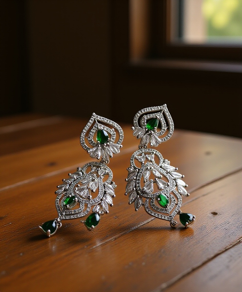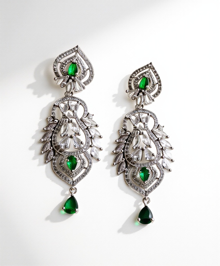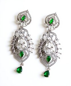 Bring timeless elegance to your jewelry collection with these White Gold Plated American Diamond Earrings with Green Glass Stones. Crafted to perfection, these statement earrings feature a luxurious white gold finish, dazzling American diamonds, and striking green glass stones that add a royal charm. Perfect for weddings, festive occasions, or evening parties, these earrings blend tradition with contemporary style.