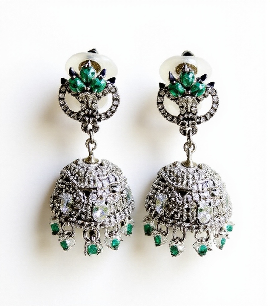 Step into a world of timeless elegance with our stunning Polki & Emerald With White Gold Plated American Diamond Jhumka Earrings. Meticulously handcrafted, these designer Polki & Emerald With White Gold Plated American Diamond Jhumka Earrings feature a beautiful arrangement of uncut Polki diamonds and vibrant emerald stones. The intricate, filigree-like design on the dome-shaped jhumka is a testament to traditional Indian craftsmanship, while the dangling emerald droplets add a touch of sophistication and movement. The top portion is adorned with brilliant green emeralds and subtle diamond accents, all set in a lustrous metal. Perfect for weddings, festive occasions, and special events, these earrings are a statement piece that will elevate any ethnic or contemporary outfit. A must-have for every jewellery lover’s collection.