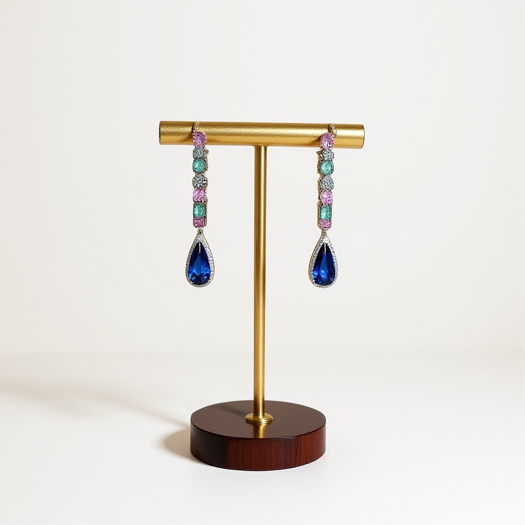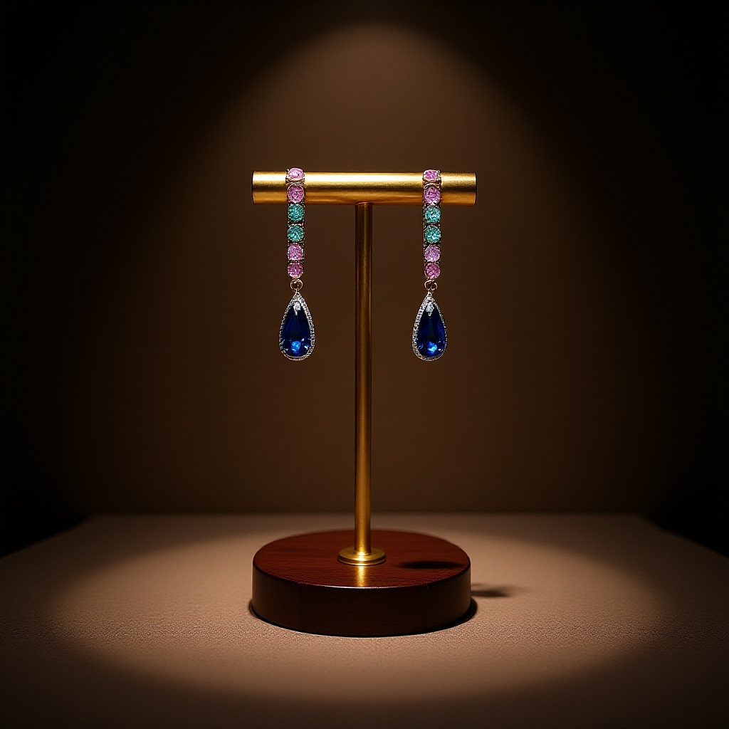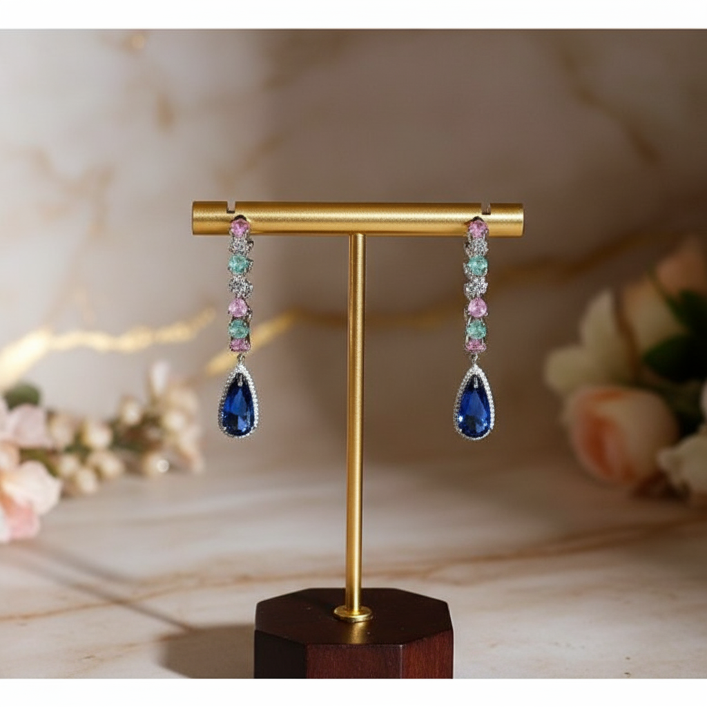 Design: Dangling earrings with a teardrop blue stone, surrounded by colorful stones.