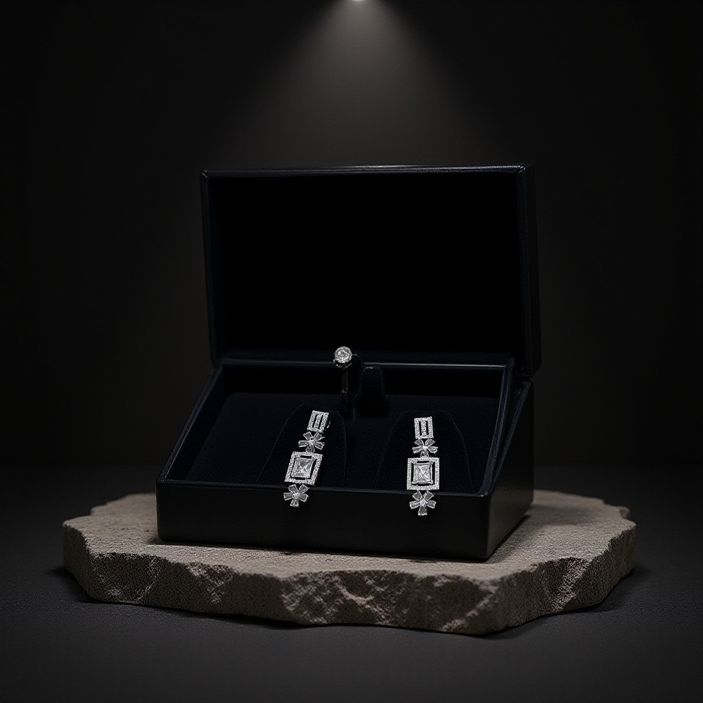Design: Rectangular stone setting framed with shimmering crystal accents and floral-inspired connectors.