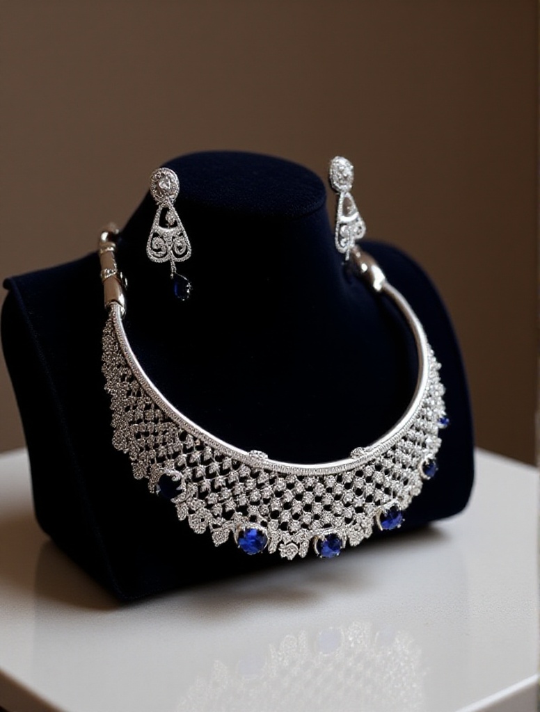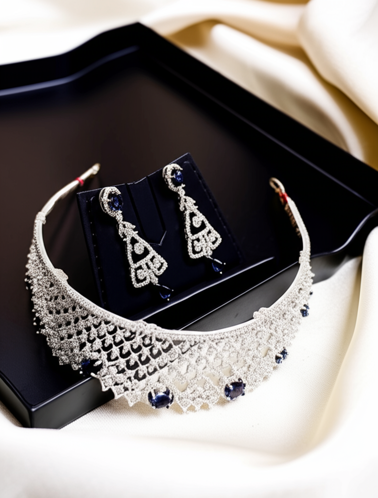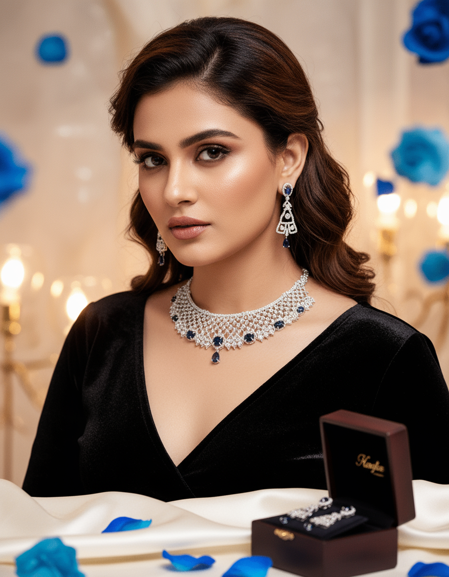 Elevate your style with this exquisite White Gold-Plated Choker Necklace Set, featuring sparkling American Diamonds and rich dark blue glass stones for an ultra-luxurious finish. Perfect for weddings, receptions, engagement parties, anniversaries, or festive occasions, this elegant set is designed for women who appreciate timeless sophistication and premium craftsmanship.