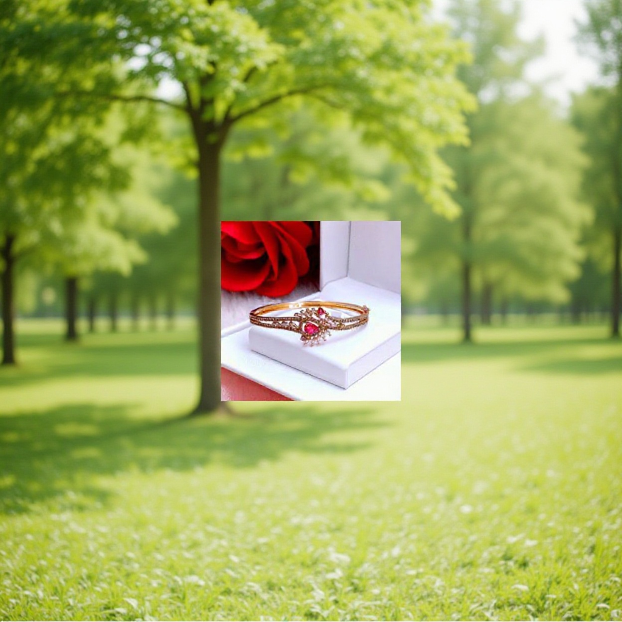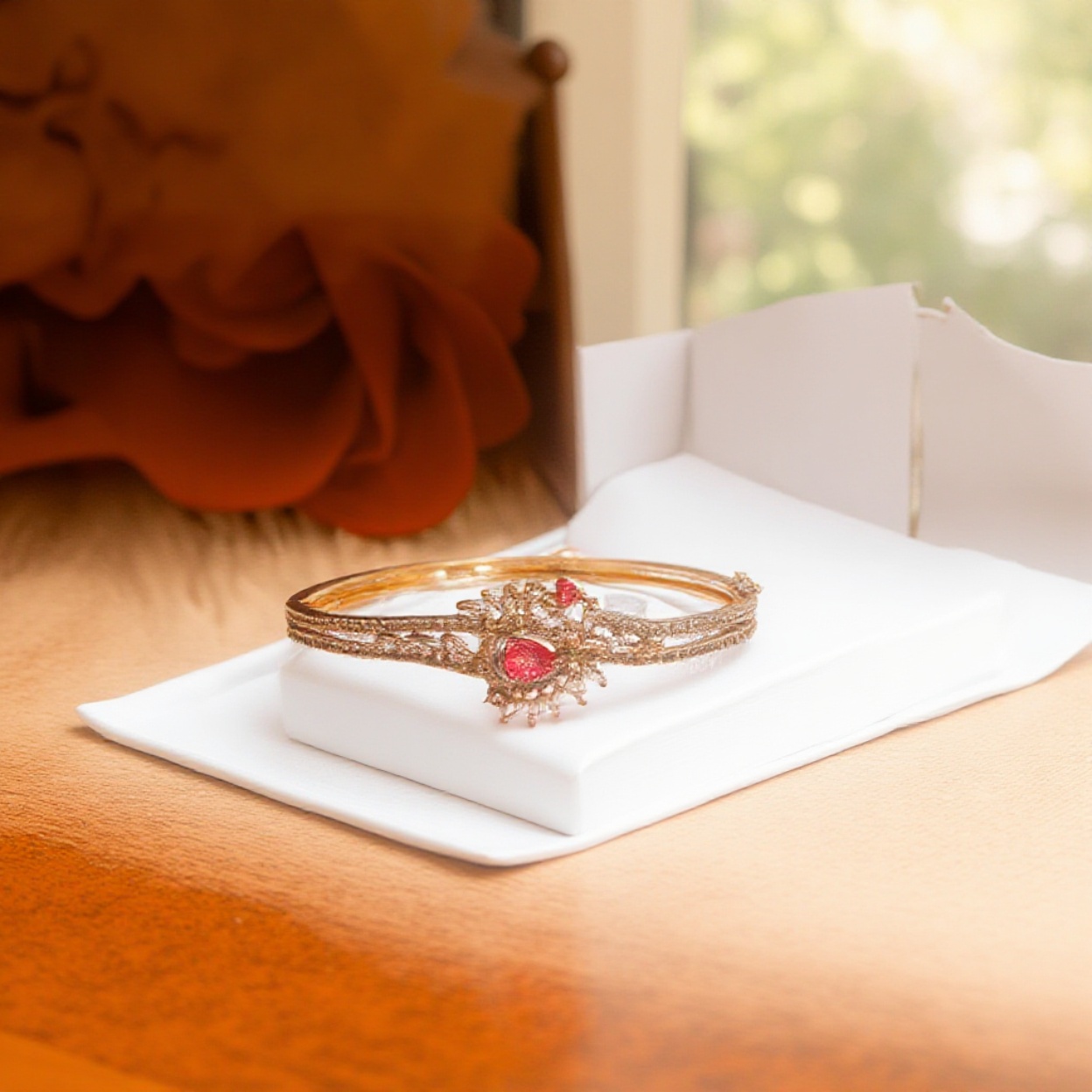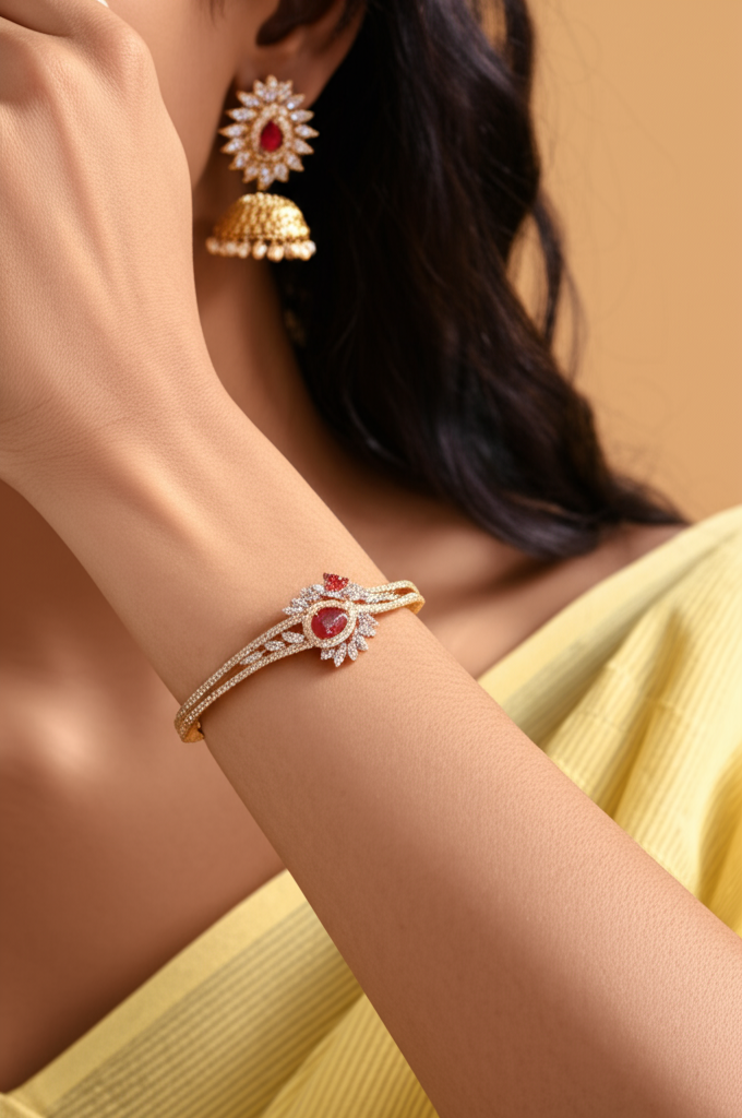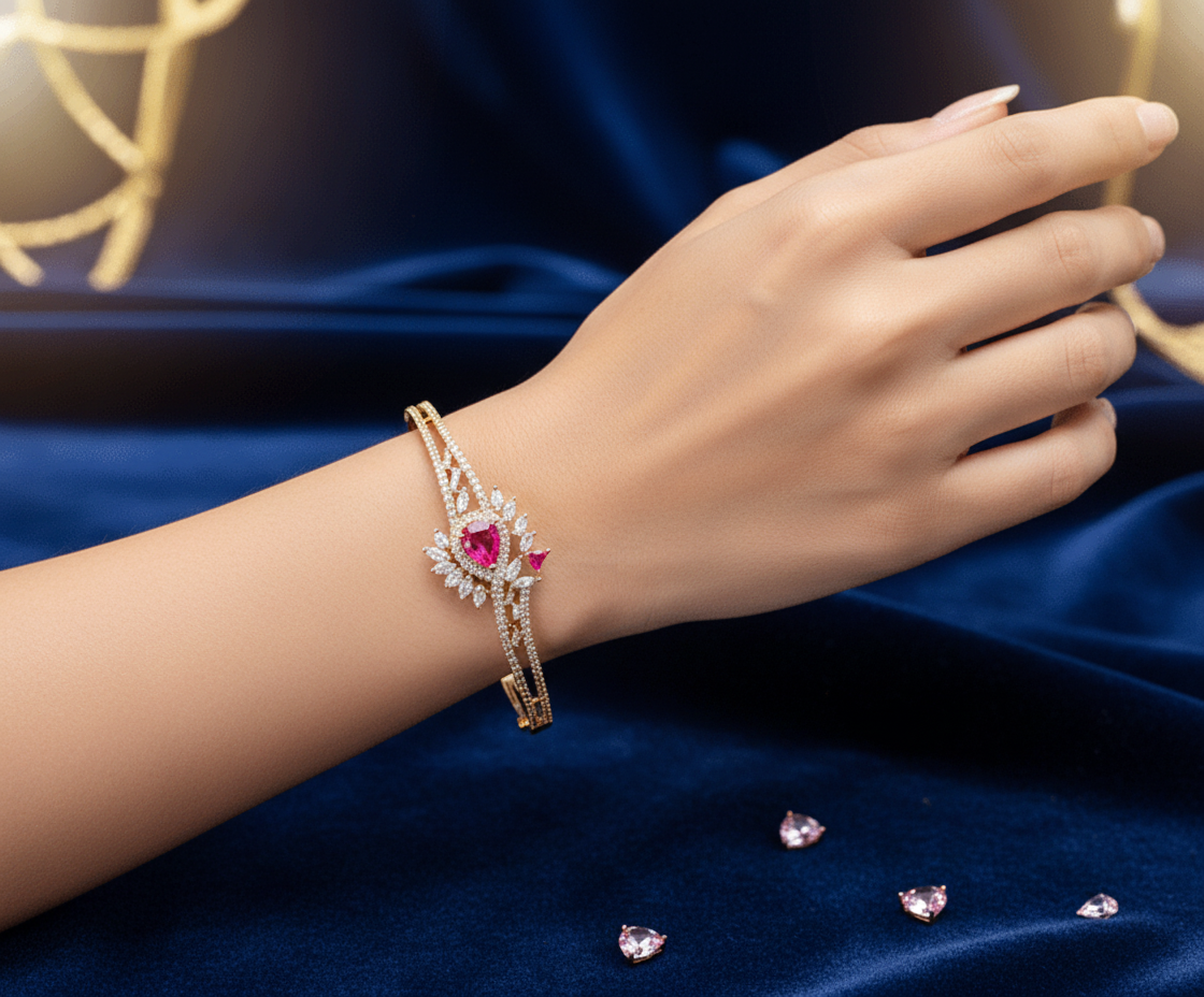Elevate your jewelry collection with this luxurious rose gold bracelet, embellished with sparkling American Diamonds and a stunning red glass centerpiece. Its elegant, handcrafted design makes it perfect for weddings, parties, and festive occasions.