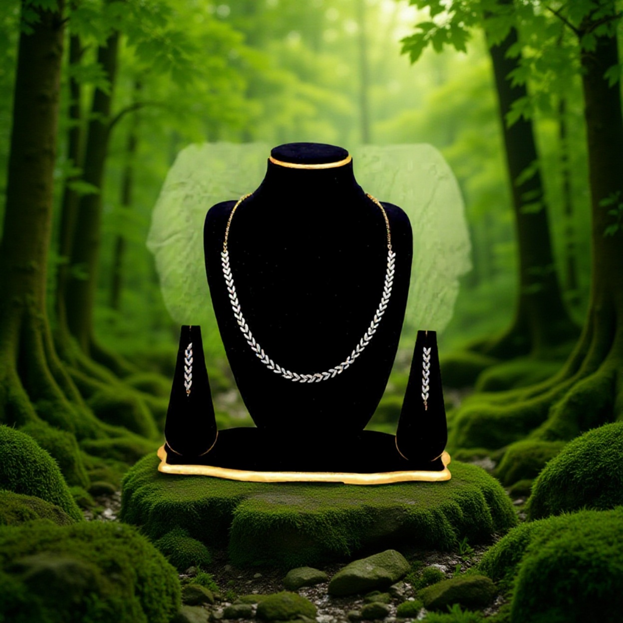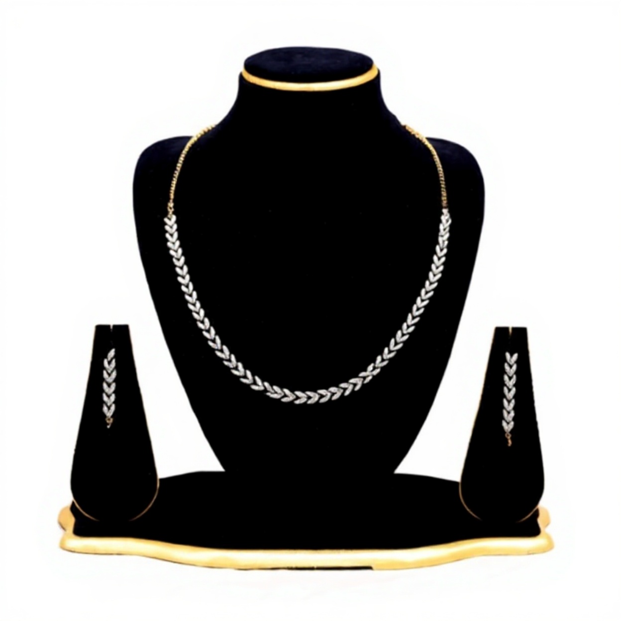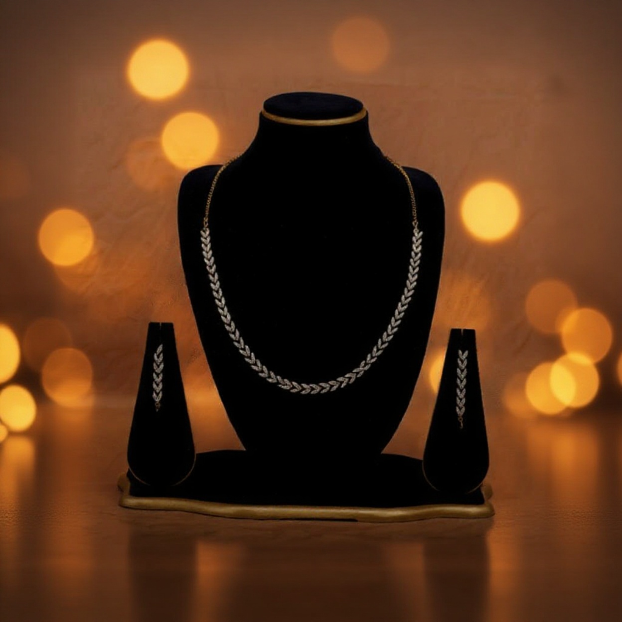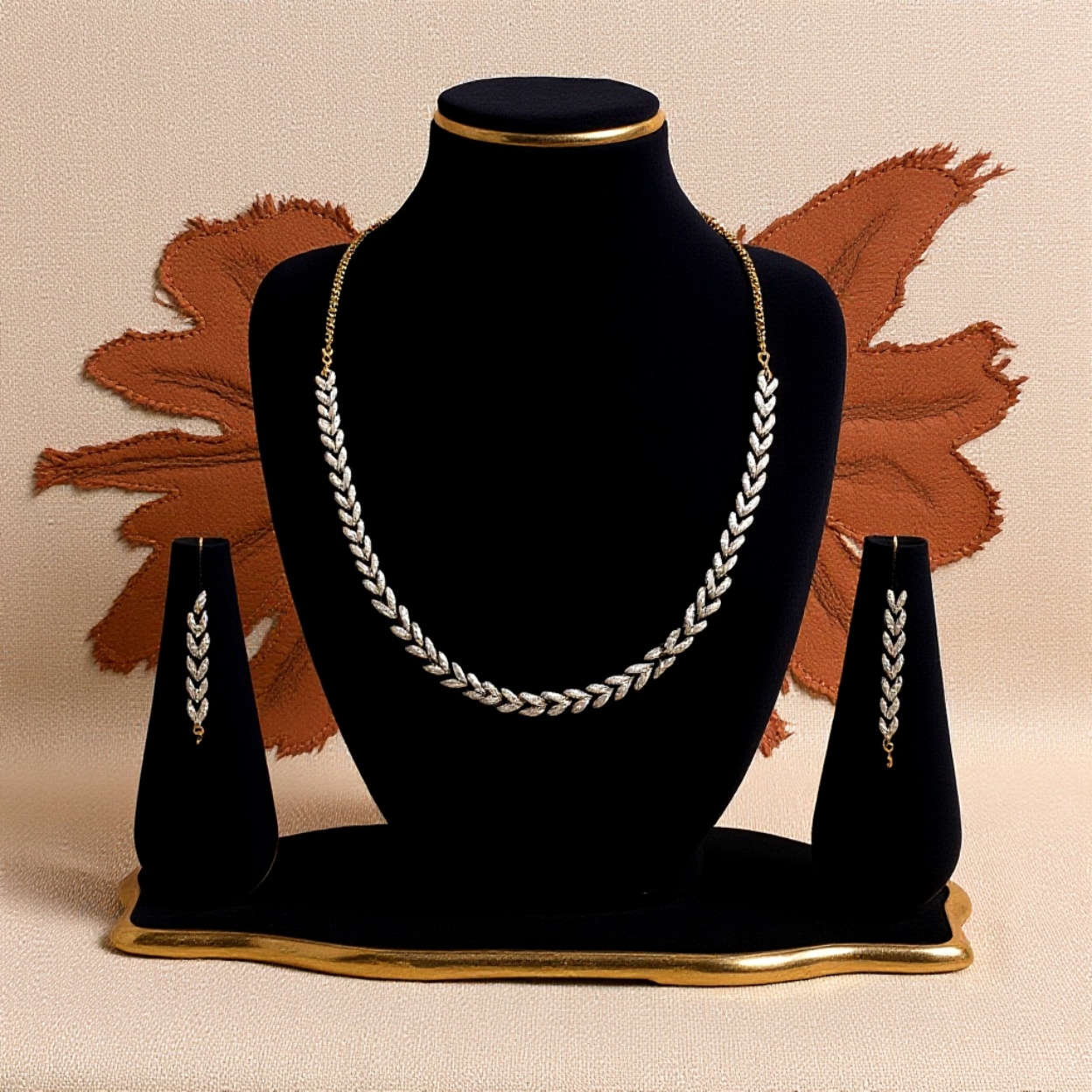 Elevate your jewelry collection with this breathtaking American Diamonds White Gold Plated Necklace With Earrings. This exquisite set is a testament to timeless elegance and sophisticated design, crafted for those who appreciate unparalleled beauty and impeccable craftsmanship. Each meticulously placed American diamond sparkles with an intense brilliance, mimicking the allure of natural gemstones, while the premium white gold plating bestows a luxurious sheen and enduring appeal. The design, inspired by delicate leaves, flows gracefully in the necklace, creating a captivating silhouette that draws the eye. The accompanying earrings mirror this intricate motif, completing a harmonious and striking ensemble.