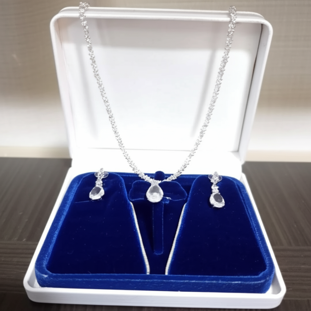 Dazzling White Gold Plated Teardrop Earrings & Pendent Set – Dazzling white gold plated teardrop earrings and Pendent set, featuring brilliant white glass stones, is the epitome of elegance and sophistication. This exquisite jewelry set is a true testament to refined craftsmanship and timeless design, meticulously created to adorn you with unparalleled sparkle and grace. The ensemble comprises a breathtaking necklace and a pair of perfectly matching earrings, both designed to capture the light and enhance your natural radiance.