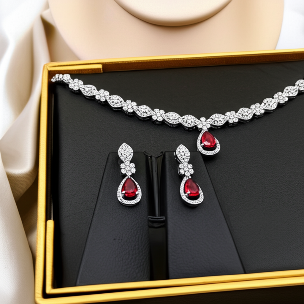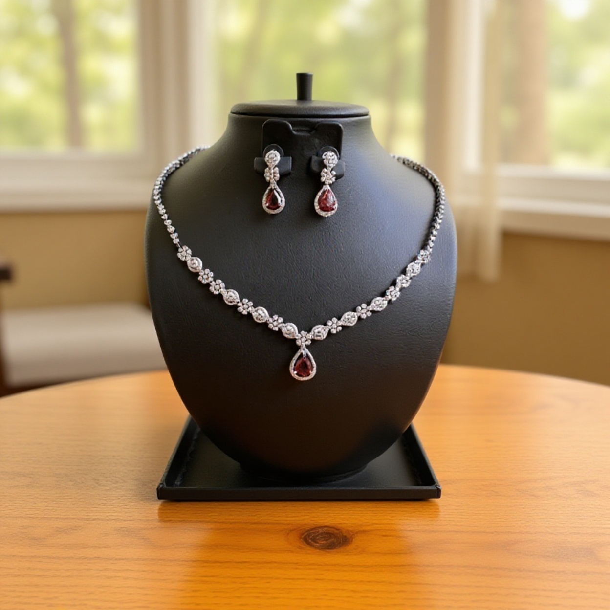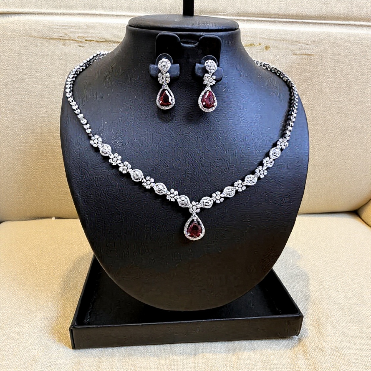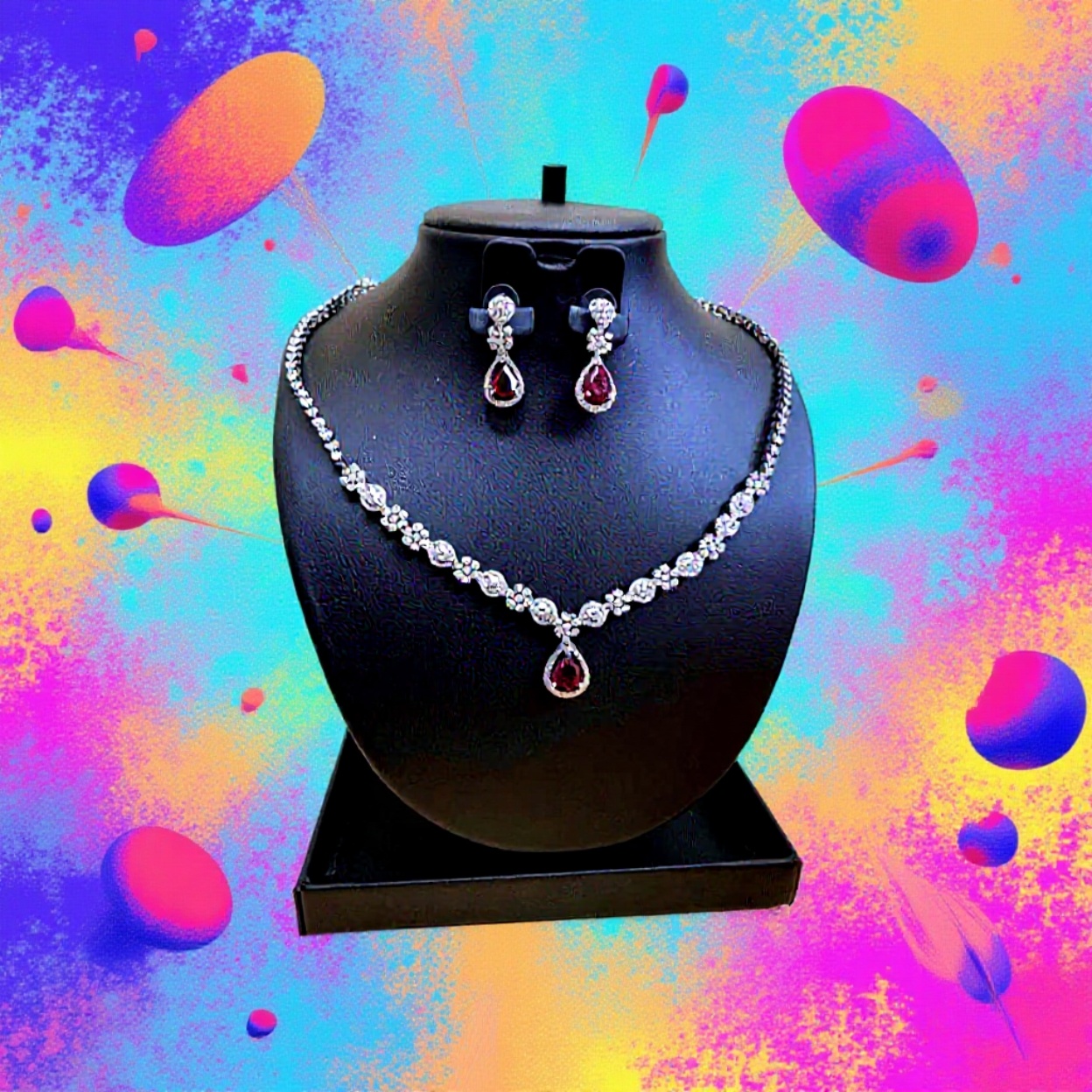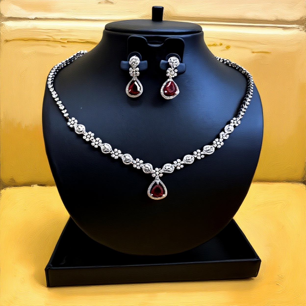 ✨ American Diamond White Gold Plated Necklace Set – Red Glass Stone Elegance