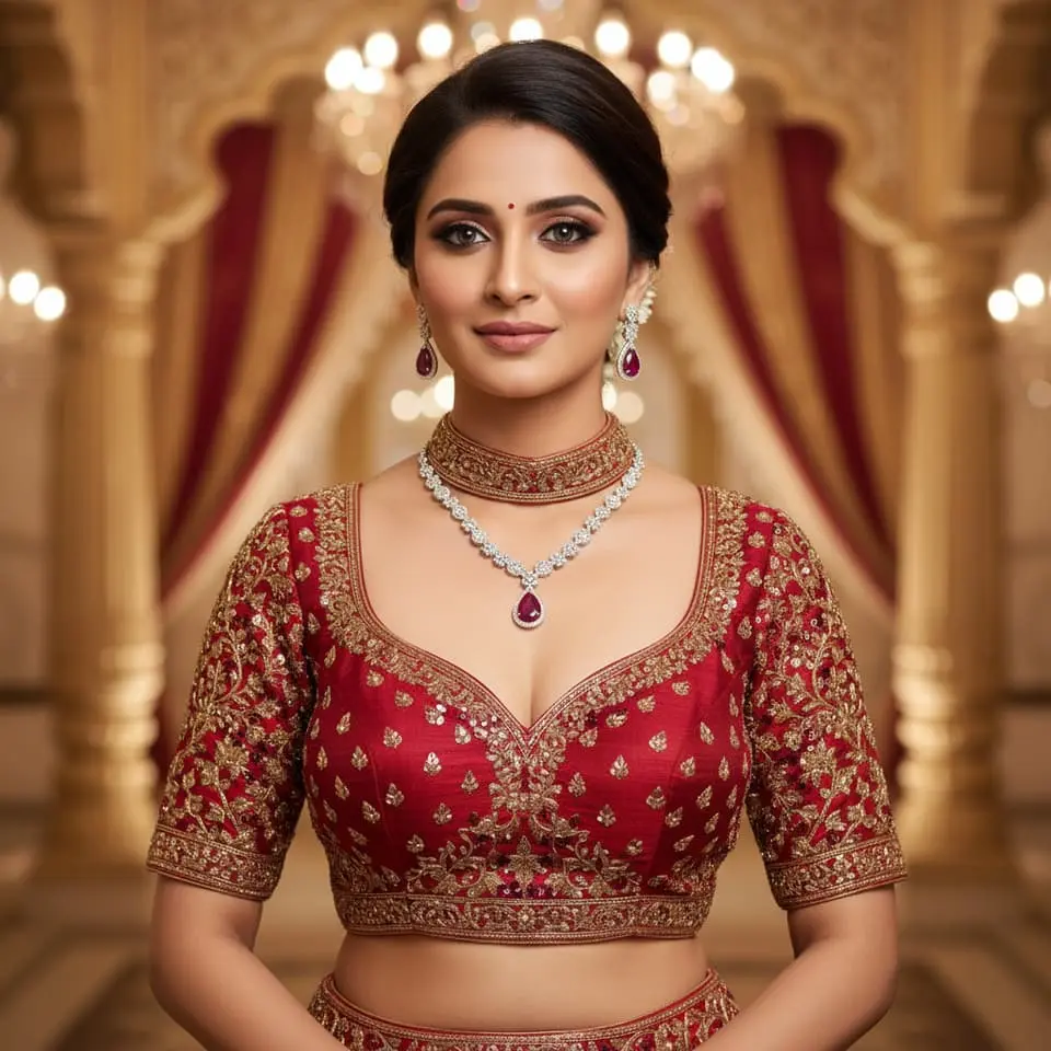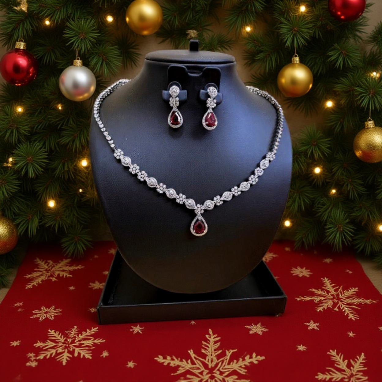 Inspired by royal aesthetics and designed for today’s fashion-conscious women, this set brings together the brilliance of American diamonds and the richness of ruby-red glass stones — set against a smooth, polished white gold-plated base. Each curve, cut, and clasp of this necklace is carefully crafted to deliver unmatched beauty and comfort.