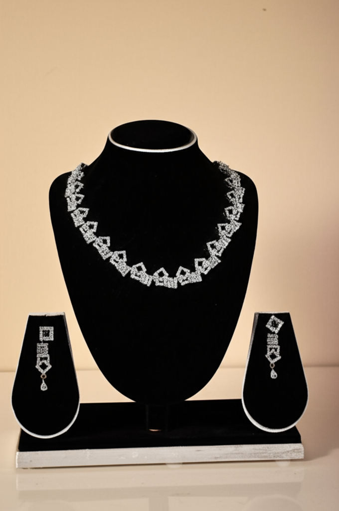 The necklace is crafted in a delicate V-shape layout, where each square and diamond motif is studded with sparkling white stones, creating a luxurious and elegant look. The matching earrings are lightweight yet striking, designed to complement the necklace perfectly without overpowering your style.