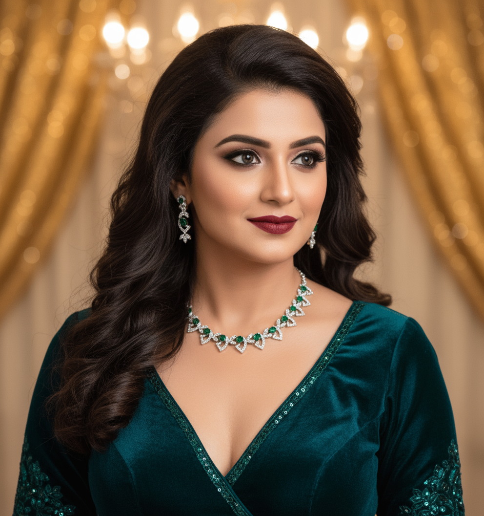 This White Gold Plated Necklace & Earrings Set is a perfect choice for women who appreciate luxury and sophistication. Featuring a delicate V-shaped design adorned with high-quality American Diamonds and green glass stones, this set is ideal for weddings, engagements, receptions, and special parties. The white gold plating ensures a premium shine while being skin-safe and long-lasting.