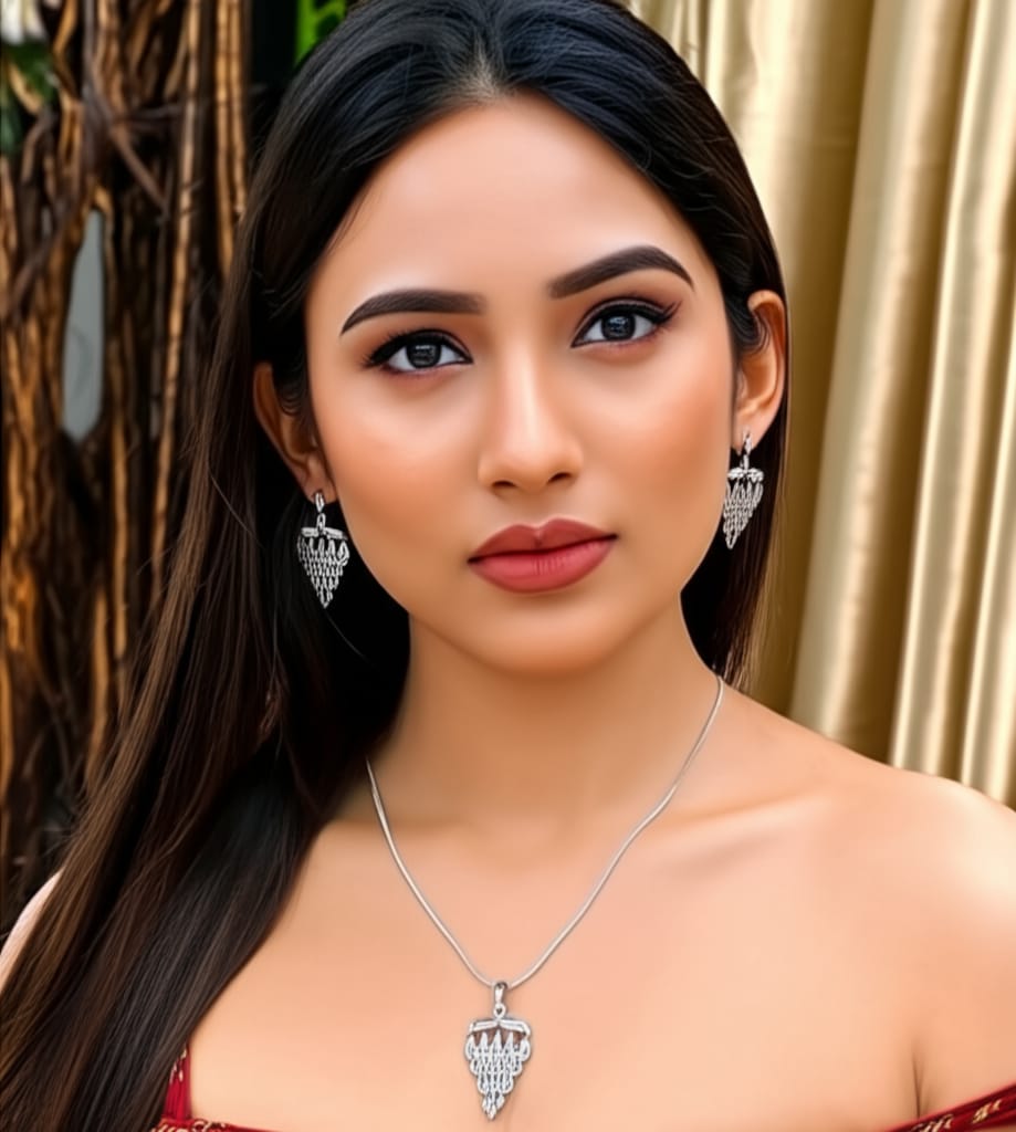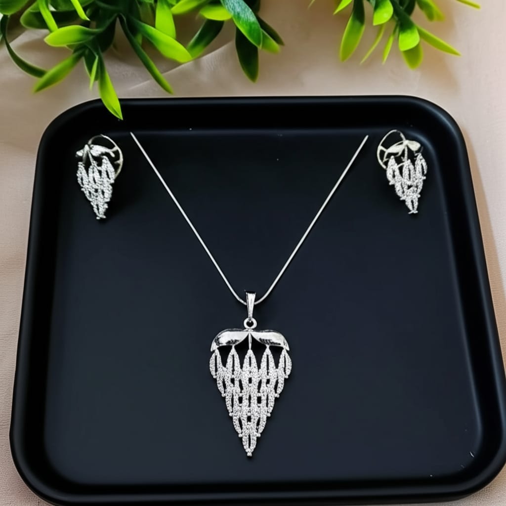 Elevate your elegance with this exquisite white gold plated pendant set, featuring sparkling American diamonds, matching earrings, and a sleek chain. Perfect for special occasions or everyday sophistication, this set adds a touch of timeless glamour to any look.