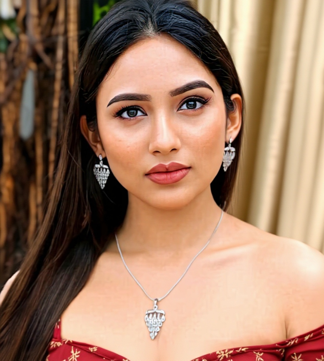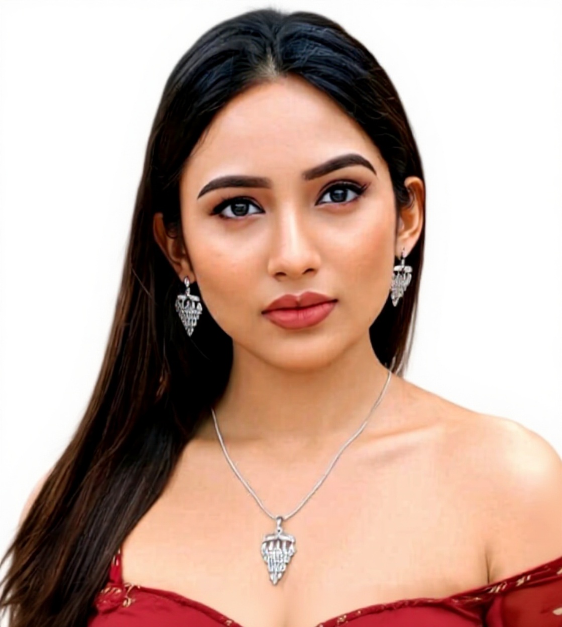 [White Gold Plated Pendant and Earrings with Red Glass Stones | Premium Designer Jewellery by Meenysaneil – https://meenysaneil-thestore.in]