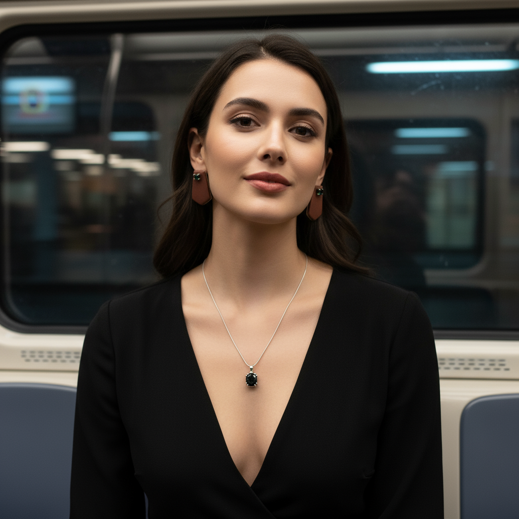 - Design: Contemporary, stylized geometric design for both the pendant and earrings, creating a cohesive and striking jewelry set. Features a delicate snake chain for the pendant.