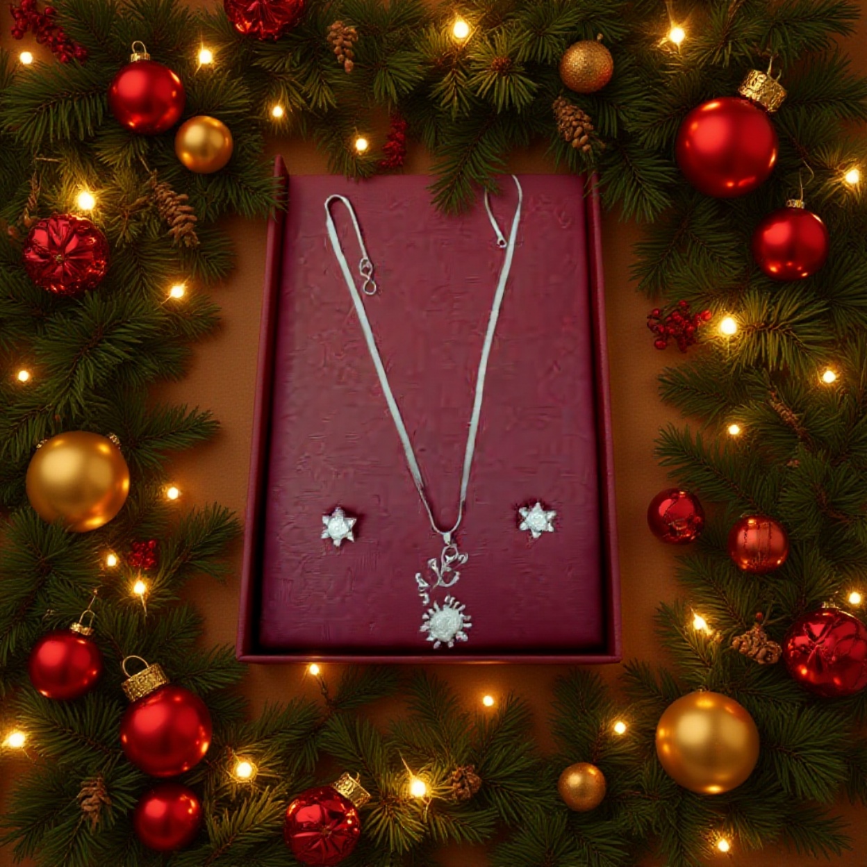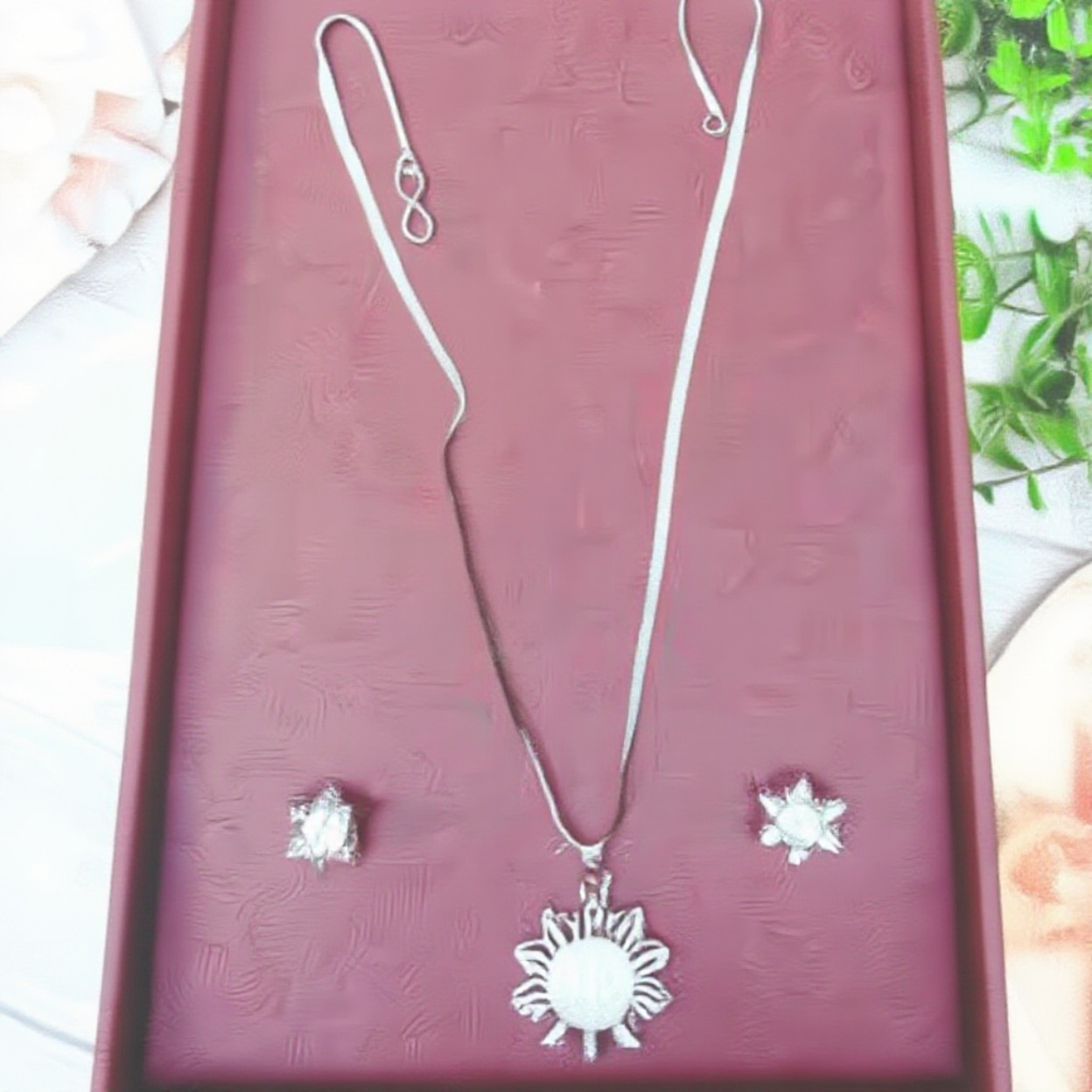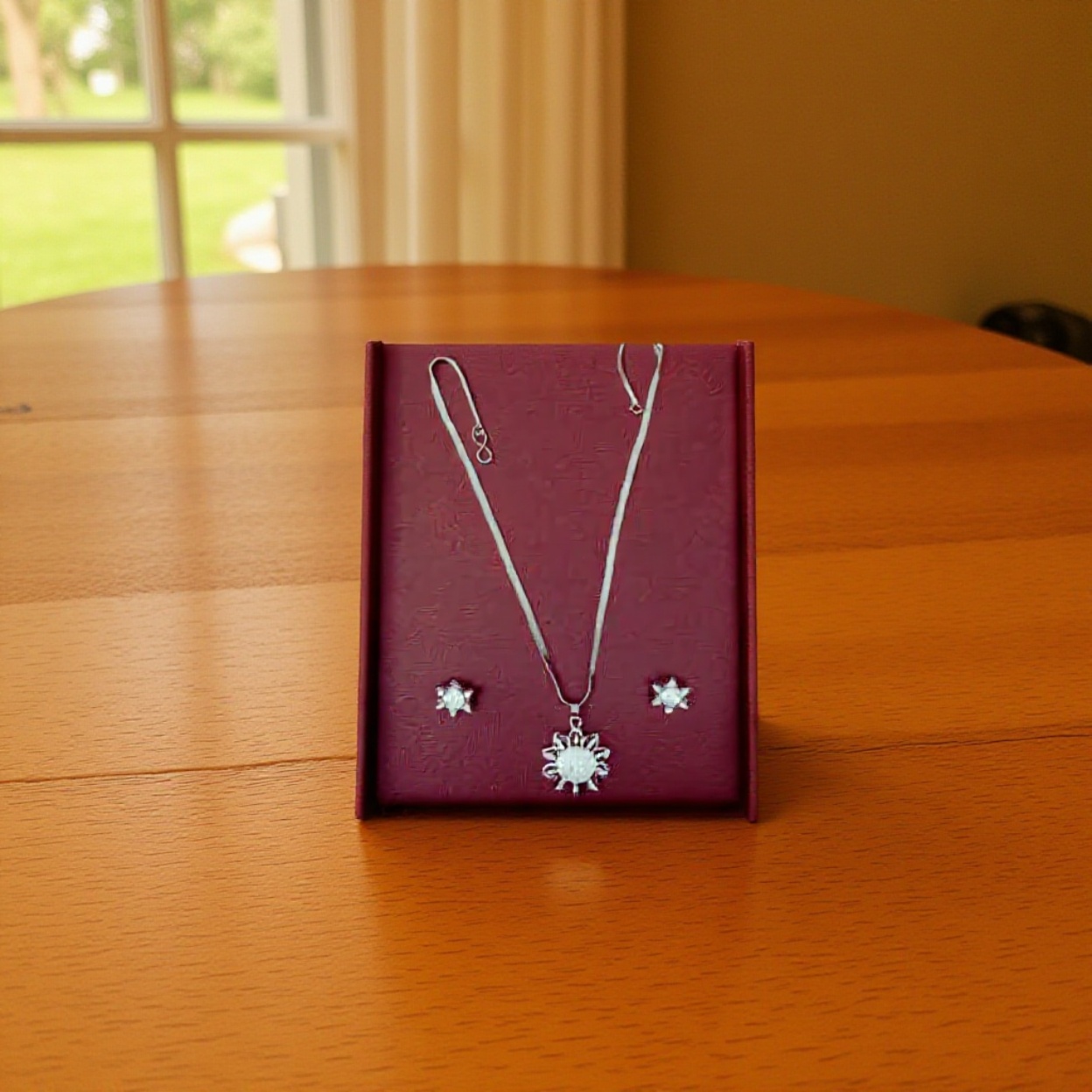 - Design: Floral halo pendant with matching stud earrings (cohesive set)
