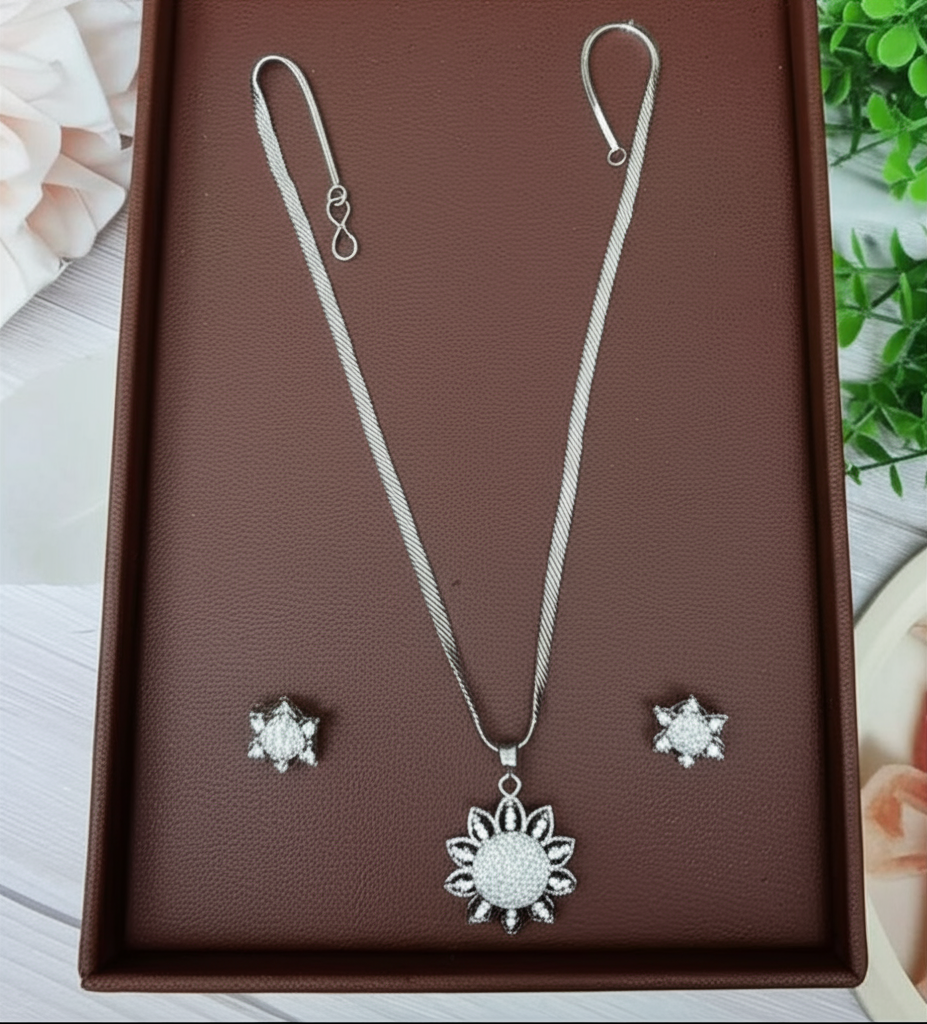 - Aesthetic: The centerpiece White Gold Plated Pendant Set features a meticulously carved floral motif — a circular center cluster surrounded by petal-like halo settings that give the illusion of a radiant flower. The matching studs mirror the central floral motif for a cohesive set.